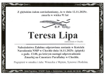 Zmarła śp. Teresa LIPA (lat 91) – (Chechło). Pogrzeb śp. Teresy Lipy odbędzie się w dniu 14 listopada 2025 r. Nabożeństwo żałobne o godz. 13.00 w Kościele Parafialnym … Czytaj całość