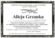 Zmarła śp. Alicja GRZANKA (lat 82) – (Krzywopłoty). Pogrzeb śp. Alicji Grzanki odbędzie się w dniu 29 października 2025 r. Nabożeństwo żałobne o godz. 14.00 w Kościele Parafialnym … Czytaj całość