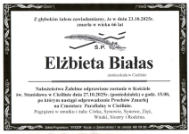 Zmarła śp. Elżbieta BIAŁAS (lat 66) – (Cieślin). Pogrzeb śp. Elżbiety Białas odbędzie się w dniu 27 października 2025 r. Nabożeństwo żałobne o godz. 15.00 w Kościele Parafialnym … Czytaj całość