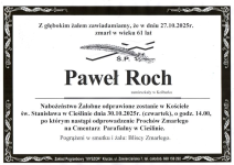 Zmarł śp. Paweł ROCH (lat 61) – (Kolbark). Pogrzeb śp. Pawła Rocha odbędzie się w dniu 30 października 2025 r. Nabożeństwo żałobne o godz. 14.00 w Kościele Parafialnym … Czytaj całość