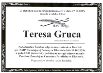 Zmarła śp. Teresa GRUCA (lat 63) – (Klucze). Pogrzeb śp. Teresy Grucy odbędzie się w dniu 30 października 2025 r. Nabożeństwo żałobne o godz. 12.00 w Kościele Parafialnym … Czytaj całość