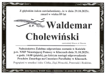Zmarł śp. Waldemar CHOLEWIŃSKI (lat 89) – (Klucze). Pogrzeb śp. Waldemara Cholewińskiego odbędzie się w dniu 31 października 2025 r. Nabożeństwo żałobne o godz. 14.00 w Kościele Parafialnym … Czytaj całość