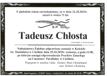 Zmarł śp. Tadeusz CHŁOSTA (lat 71) – (Golczowice). Pogrzeb śp. Tadeusza Chłosty odbędzie się w dniu 25 października 2025 r. Nabożeństwo żałobne o godz. 11.00 w Kościele Parafialnym … Czytaj całość