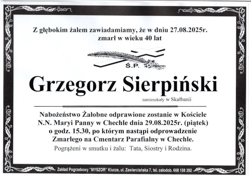 Pogrzeb śp. Grzegorza Sierpińskiego odbędzie się w dniu 29 sierpnia 2025 r. Nabożeństwo żałobne o godz. 15.30 w Kościele Parafialnym w Chechle. Sprawdź szczegóły uroczystości pogrzebowych klikając w klepsydrę… Modlimy się za duszę śp. Grzegorza, a rodzinie zmarłego składamy kondolencje.