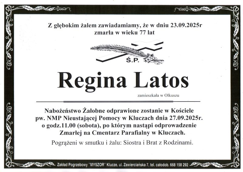 Pogrzeb śp. Reginy Latos odbędzie się w dniu 27 września 2025 r. Nabożeństwo żałobne o godz. 11.00 w Kościele Parafialnym w Kluczach. Sprawdź szczegóły uroczystości pogrzebowych klikając w klepsydrę… Modlimy się za duszę śp. Reginy, a rodzinie zmarłej składamy kondolencje.