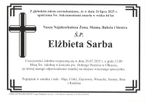 Zmarła śp. Elżbieta SARBA (lat 64) – (Olkusz). Pogrzeb śp. Elżbiety Sarby odbędzie się w dniu 26 lipca 2025 r. Nabożeństwo żałobne o godz. 12.00 w Kościele pw. … Czytaj całość