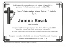Zmarła śp. Janina BOSAK (lat 97) – (Minoga). Pogrzeb śp. Janiny Bosak odbędzie się w dniu 29 lipca 2025 r. Nabożeństwo żałobne o godz. 12.00 w Kościele Parafialnym … Czytaj całość