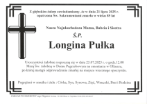 Zmarła śp. Longina PUŁKA (lat 85) – (Olkusz). Pogrzeb śp. Longiny Pułki odbędzie się w dniu 25 lipca 2025 r. Nabożeństwo żałobne o godz. 12.00 w Domu Pogrzebowym … Czytaj całość