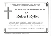 Zmarł śp. Robert RYŁKO (lat 57) – (Olkusz). Pogrzeb śp. Roberta Ryłko odbędzie się w dniu 25 lipca 2025 r. Nabożeństwo żałobne o godz. 13.00 w Domu Pogrzebowym … Czytaj całość