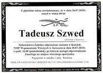 Zmarł śp. Tadeusz SZWED (lat 68) – (Jaroszowiec). Pogrzeb śp. Tadeusza Szweda odbędzie się w dniu 28 lipca 2025 r. Nabożeństwo żałobne o godz. 16.00 w Kościele Parafialnym … Czytaj całość