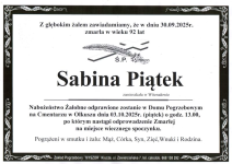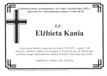 Zmarła śp. Teresa SĘDZIELOWSKA (lat 89) – (Olkusz). Pogrzeb śp. Teresy Sędzielowskiej odbędzie się w dniu 9 października 2025 r. Nabożeństwo żałobne o godz. 11.00 w Domu Pogrzebowym … Czytaj całość