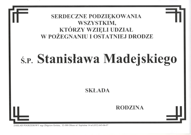 Podziękowania za udział w pogrzebie śp. Stanisława Madejskiego przez Administracja | 22 września 2025 - 21:00 |24 września 2025 Olkusz (Miasto i Gm.), Powiat Olkuski PODZIĘKOWANIE za udział w pożegnaniu i ostatniej drodze śp. Stanisława MADEJSKIEGO składa Rodzina Udostępnij: Kliknij, aby udostępnić na Facebooku (Otwiera się w nowym oknie) Facebook Kliknij, aby wysłać odnośnik e-mailem do znajomego (Otwiera się w nowym oknie) E-mail Kliknij, aby udostępnić na X (Otwiera się w nowym oknie) X Kliknij, aby udostępnić na WhatsApp (Otwiera się w nowym oknie) WhatsApp Kliknij, aby udostępnić na Telegramie (Otwiera się w nowym oknie) Telegram Dodaj do zakładek Link.
