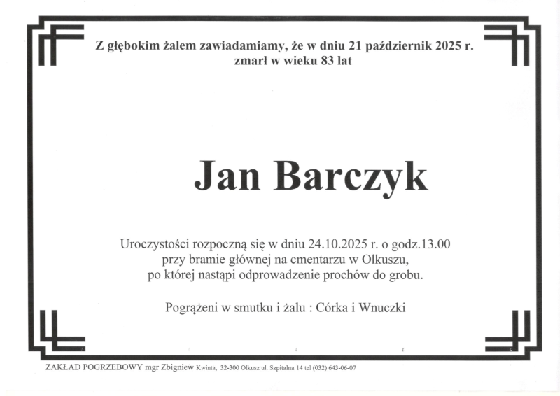 Pogrzeb Jana Barczyka odbędzie się w dniu 24 października 2025 r. Uroczystości żałobne o godz. 13.00 przy bramie głównej na cmentarzu w Olkuszu. Sprawdź szczegóły uroczystości pogrzebowych klikając w klepsydrę… Wspominamy zmarłego Jana, a rodzinie składamy kondolencje.