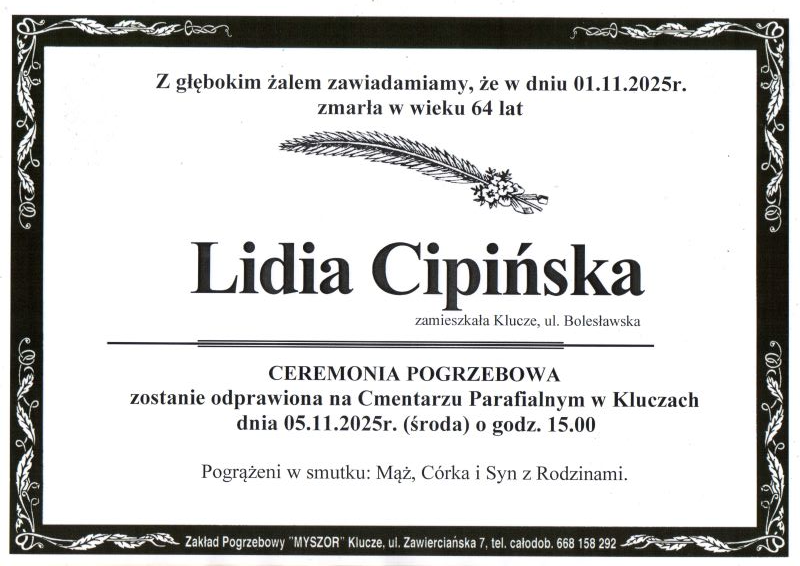 Pogrzeb Lidii Cipińskiej odbędzie się w dniu 5 listopada 2025 r. Ceremonia Pogrzebowa o godz. 15.00 na cmentarzu w Kluczach. Sprawdź szczegóły uroczystości pogrzebowych klikając w klepsydrę… Wspominamy zmarłą Lidię, a rodzinie składamy kondolencje.