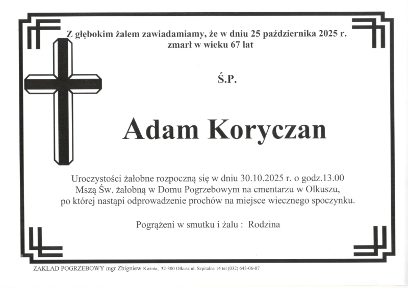 Pogrzeb śp. Adama Koryczana odbędzie się w dniu 30 października 2025 r. Nabożeństwo żałobne o godz. 13.00 w Domu Pogrzebowym na cmentarzu w Olkuszu. Sprawdź szczegóły uroczystości pogrzebowych klikając w klepsydrę… Modlimy się za duszę śp. Adama, a rodzinie zmarłego składamy kondolencje.