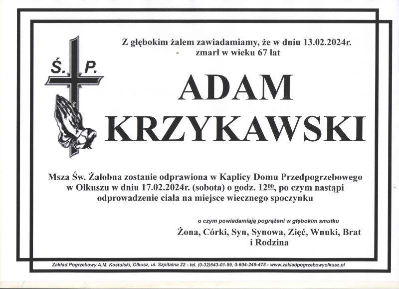 Zmarł śp. Adam KRZYKAWSKI (lat 67) – (Olkusz).