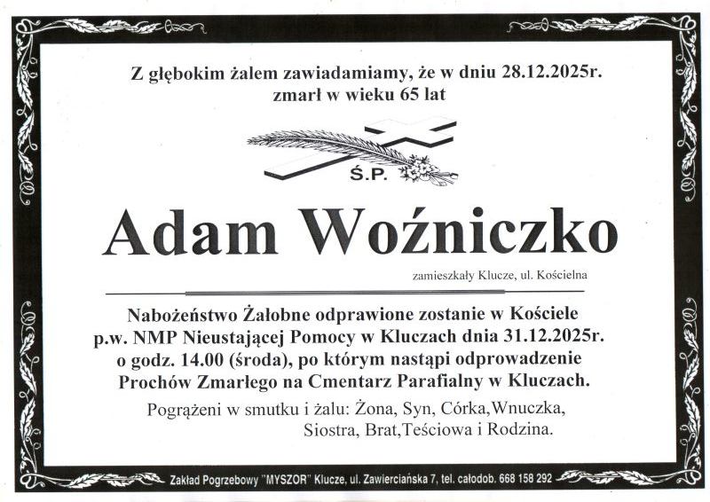Pogrzeb śp. Adama Woźniczki odbędzie się w dniu 31 grudnia 2025 r. Nabożeństwo żałobne o godz. 14.00 w Kościele Parafialnym w Kluczach. Sprawdź szczegóły uroczystości pogrzebowych klikając w klepsydrę… Modlimy się za duszę śp. Adama, a rodzinie zmarłego składamy kondolencje.