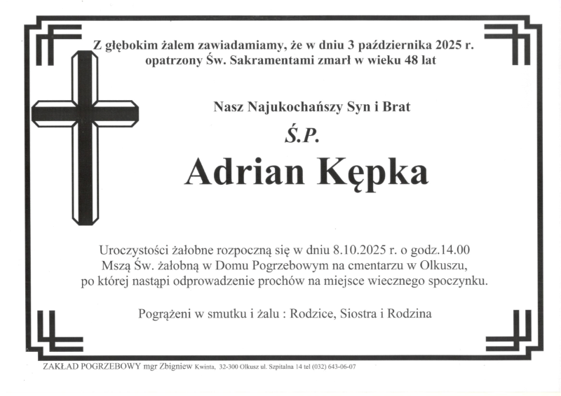 Zmarł śp. Adrian KĘPKA (lat 48) – (Olkusz).