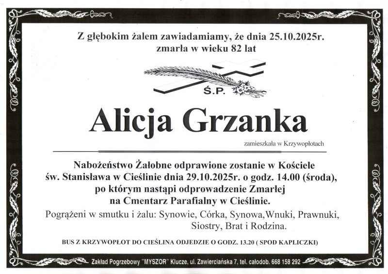 Pogrzeb śp. Alicji Grzanki odbędzie się w dniu 29 października 2025 r. Nabożeństwo żałobne o godz. 14.00 w Kościele Parafialnym w Krzywopłotach. Sprawdź szczegóły uroczystości pogrzebowych klikając w klepsydrę… Modlimy się za duszę śp. Alicji, a rodzinie zmarłej składamy kondolencje.