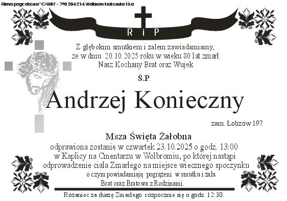 Pogrzeb śp. Andrzeja Koniecznego odbędzie się w dniu 23 października 2025 r. Nabożeństwo żałobne o godz. 13:00 w Kaplicy na cmentarzu w Wolbromiu. Sprawdź szczegóły uroczystości pogrzebowych klikając w klepsydrę… Modlimy się za dusze śp. Andrzeja, a rodzinie zmarłego składamy kondolencje.