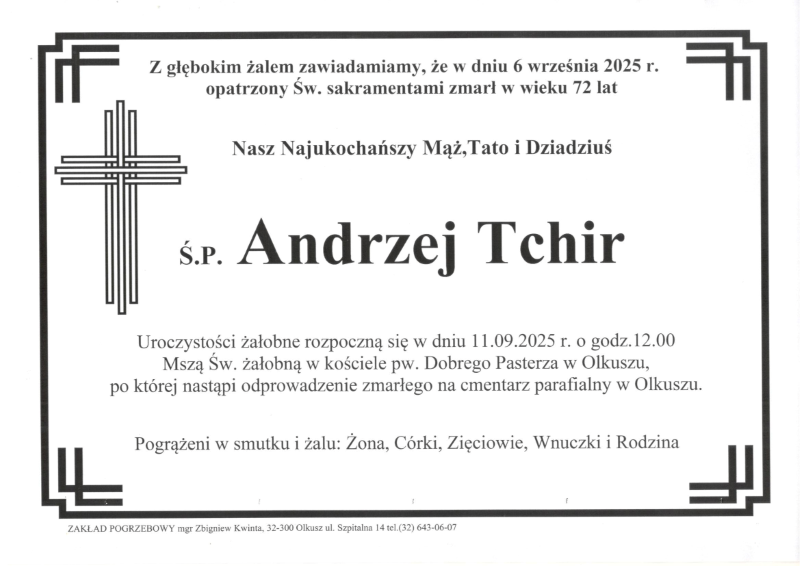 Pogrzeb śp. Andrzeja Tchira odbędzie się w dniu 11 września 2025 r. Nabożeństwo żałobne o godz. 12.00 w Kościele pw. Dobrego Pasterza w Olkuszu. Sprawdź szczegóły uroczystości pogrzebowych klikając w klepsydrę… Modlimy się za duszę śp. Andrzeja, a rodzinie zmarłego składamy kondolencje.