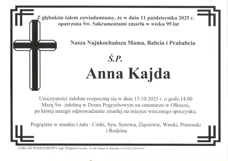 Zmarła śp. Anna KAJDA (lat 95) – (Olkusz).