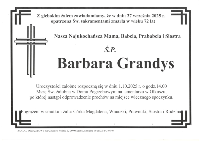 Pogrzeb śp. Barbary Grandys odbędzie się w dniu 1 października 2025 r. Nabożeństwo żałobne o godz. 14.00 w Domu Pogrzebowym na cmentarzu w Olkuszu. Sprawdź szczegóły klikając w klepsydrę… Modlimy się za duszę śp. Barbary, a rodzinie zmarłej składamy kondolencje.