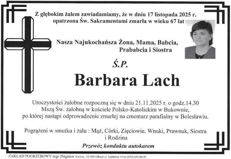 Pogrzeb śp. Barbary Lach odbędzie się w dniu 21 listopada 2025 r. Nabożeństwo żałobne o godz. 14.30 w Kościele Polsko-Katolickim w Bukownie. Sprawdź szczegóły klikając w klepsydrę… Modlimy się za duszę śp. Barbary, a rodzinie zmarłej składamy kondolencje.