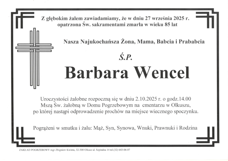 Pogrzeb śp. Barbary Wencel odbędzie się w dniu 2 października 2025 r. Nabożeństwo żałobne o godz. 14.00 w Domu Pogrzebowym na cmentarzu w Olkuszu. Sprawdź szczegóły klikając w klepsydrę… Modlimy się za duszę śp. Barbary, a rodzinie zmarłej składamy kondolencje.