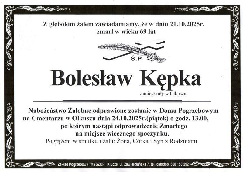 Zmarł śp. Bolesław KĘPKA (lat 69) – (Olkusz).
