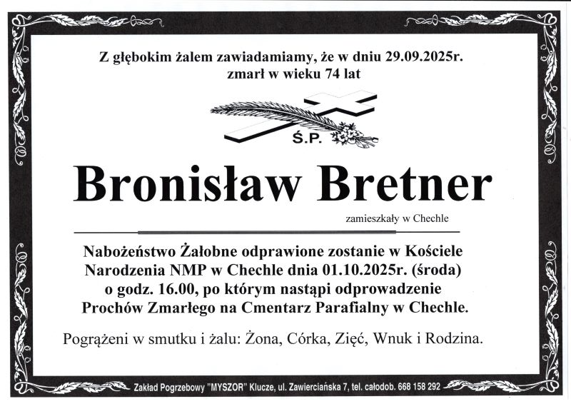 Pogrzeb śp. Bronisława Bretnera odbędzie się w dniu 1 października 2025 r. Nabożeństwo żałobne o godz. 16.00 w Kościele Parafialnym w Chechle. Sprawdź szczegóły uroczystości pogrzebowych klikając w klepsydrę… Modlimy się za duszę śp. Bronisława, a rodzinie zmarłego składamy kondolencje.