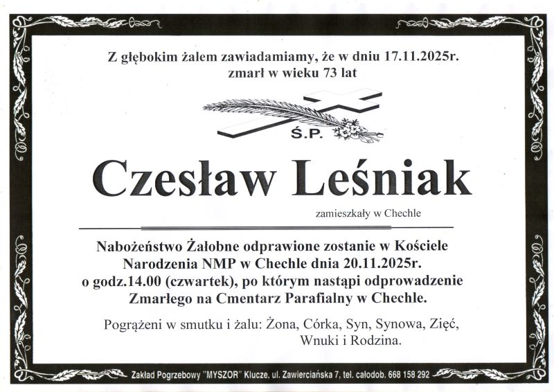 Pogrzeb śp. Czesława Leśniaka odbędzie się w dniu 20 listopada 2025 r. Nabożeństwo żałobne o godz. 14.00 w Kościele Parafialnym w Chechle. Sprawdź szczegóły uroczystości pogrzebowych klikając w klepsydrę… Modlimy się za duszę śp. Czesława, a rodzinie zmarłego składamy kondolencje.