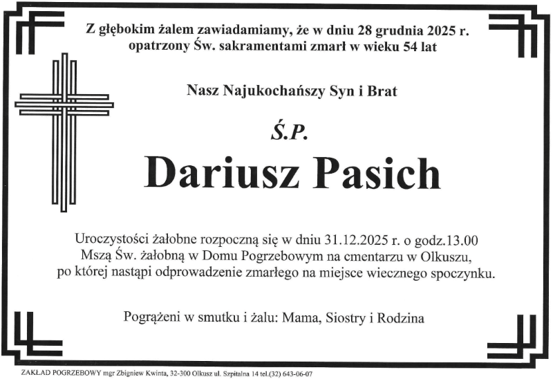 Pogrzeb śp. Dariusza Pasicha odbędzie się w dniu 31 grudnia 2025 r. Nabożeństwo żałobne o godz. 13.00 w Domu Pogrzebowym na cmentarzu w Olkuszu. Sprawdź szczegóły uroczystości pogrzebowych klikając w klepsydrę… Modlimy się za duszę śp. Dariusza, a rodzinie zmarłego składamy kondolencje.
