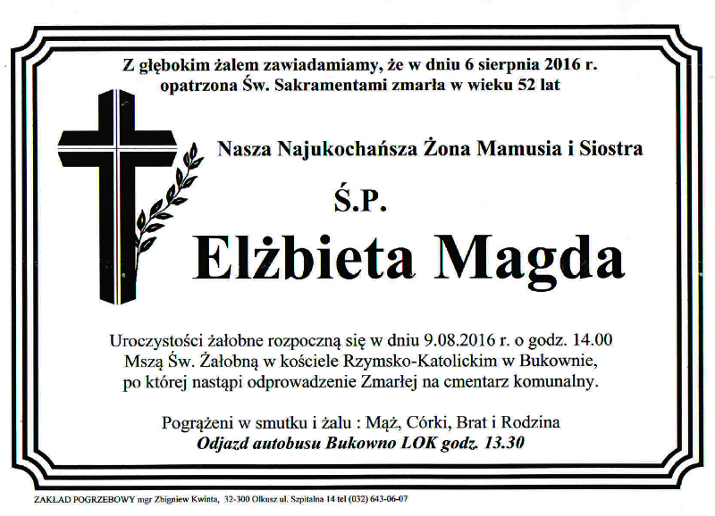 Zmarła śp. Elżbieta MAGDA – lat 52 (Bukowno).