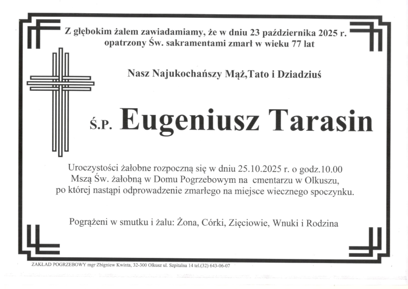 Zmarł śp. Eugeniusz TARASIN (lat 77) – (Olkusz).