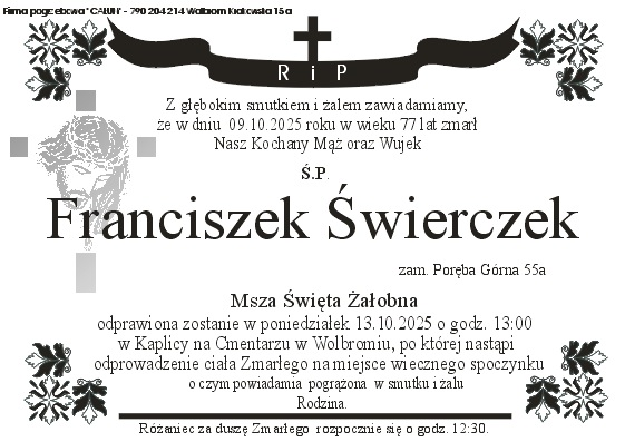 Pogrzeb śp. Franciszka Świerczka odbędzie się w dniu 13 października 2025 r. Nabożeństwo żałobne o godz. 13:00 w Kaplicy na cmentarzu w Wolbromiu. Sprawdź szczegóły uroczystości pogrzebowych klikając w klepsydrę… Modlimy się za dusze śp. Franciszka, a rodzinie zmarłego składamy kondolencje.