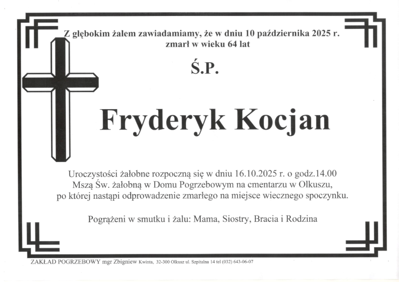 Zmarł śp. Fryderyk KOCJAN (lat 64) – (Olkusz).
