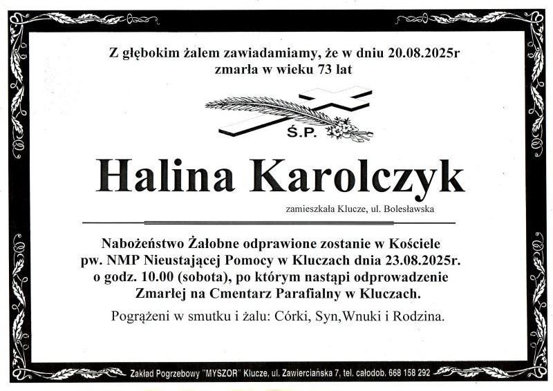 Pogrzeb śp. Haliny Karolczyk odbędzie się w dniu 23 sierpnia 2025 r. Nabożeństwo żałobne o godz. 10.00 w Kościele Parafialnym w Kluczach. Sprawdź szczegóły uroczystości pogrzebowych klikając w klepsydrę… Modlimy się za duszę śp. Haliny, a rodzinie zmarłej składamy kondolencje.