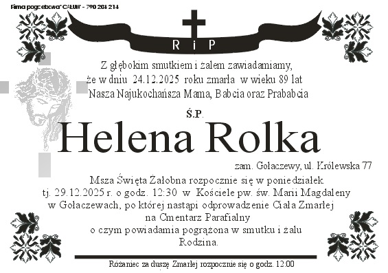 Pogrzeb śp. Heleny Rolki odbędzie się w dniu 29 grudnia 2025 r. Nabożeństwo żałobne o godz. 12.30 w Kościele Parafialnym w Gołaczewach. Sprawdź szczegóły uroczystości pogrzebowych klikając w klepsydrę… Modlimy się za dusze śp. Heleny, a rodzinie zmarłej składamy kondolencje.