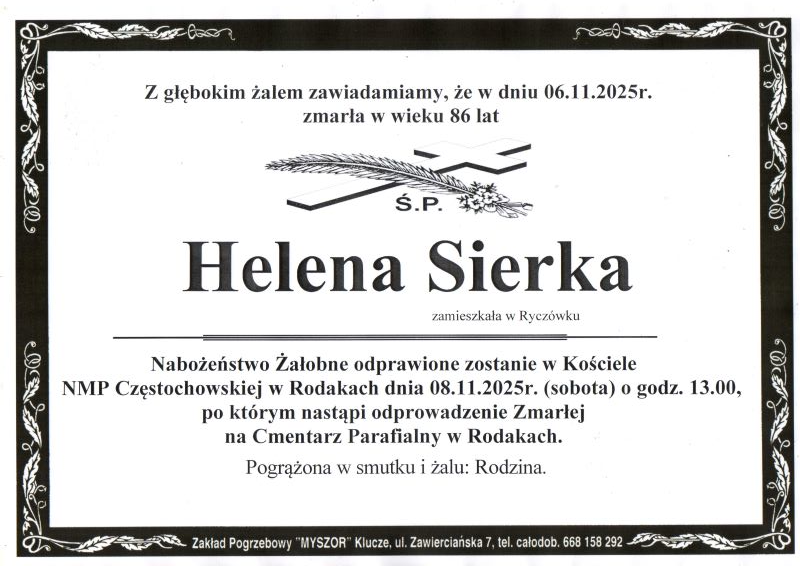 Pogrzeb śp. Heleny Sierki odbędzie się w dniu 8 listopada 2025 r. Nabożeństwo żałobne o godz. 13.00 w Kościele Parafialnym w Rodakach. Sprawdź szczegóły uroczystości pogrzebowych klikając w klepsydrę… Modlimy się za duszę śp. Heleny, a rodzinie zmarłej składamy kondolencje.