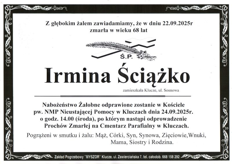 Pogrzeb śp. Irminy Ściążko odbędzie się w dniu 24 września 2025 r. Nabożeństwo żałobne o godz. 14.00 w Kościele Parafialnym w Kluczach. Sprawdź szczegóły uroczystości pogrzebowych klikając w klepsydrę… Modlimy się za duszę śp. Irminy, a rodzinie zmarłej składamy kondolencje.