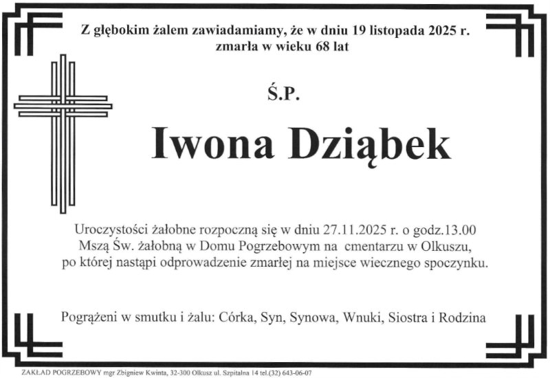 Pogrzeb śp. Iwony Dziąbek odbędzie się w dniu 27 listopada 2025 r. Nabożeństwo żałobne o godz. 13.00 w Domu Pogrzebowym na cmentarzu w Olkuszu. Sprawdź szczegóły klikając w klepsydrę… Modlimy się za duszę śp. Iwony, a rodzinie zmarłej składamy kondolencje.