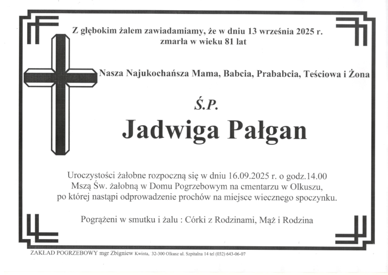 Zmarła śp. Jadwiga PAŁGAN (lat 81) – (Olkusz).