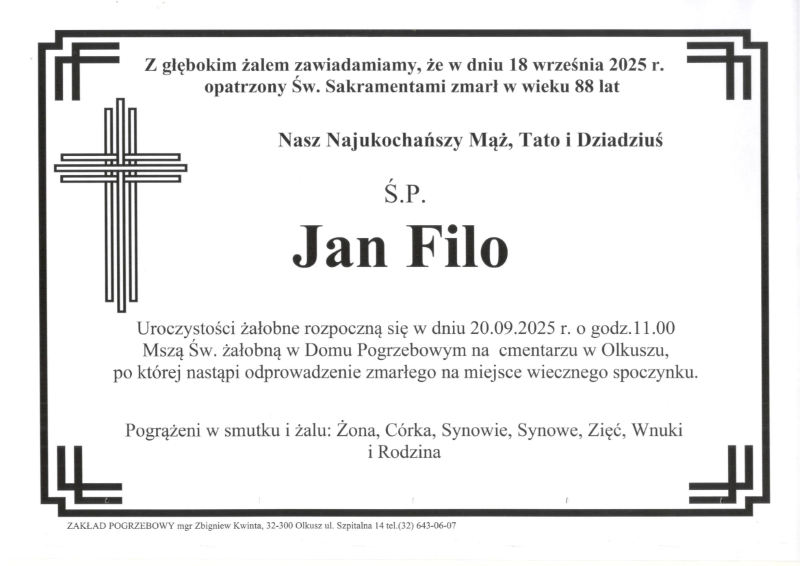 Zmarł śp. Jan FILO (lat 88) – (Olkusz).