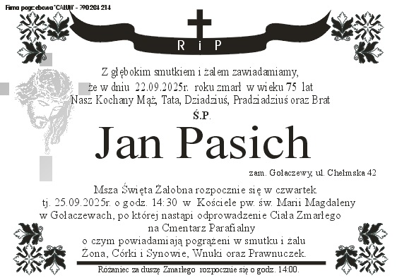 Pogrzeb śp. Jana Pasicha odbędzie się w dniu 25 września 2025 r. Nabożeństwo żałobne o godz. 14:30 w Kościele Parafialnym w Gołaczewach. Sprawdź szczegóły uroczystości pogrzebowych klikając w klepsydrę… Modlimy się za dusze śp. Jana, a rodzinie zmarłego składamy kondolencje.