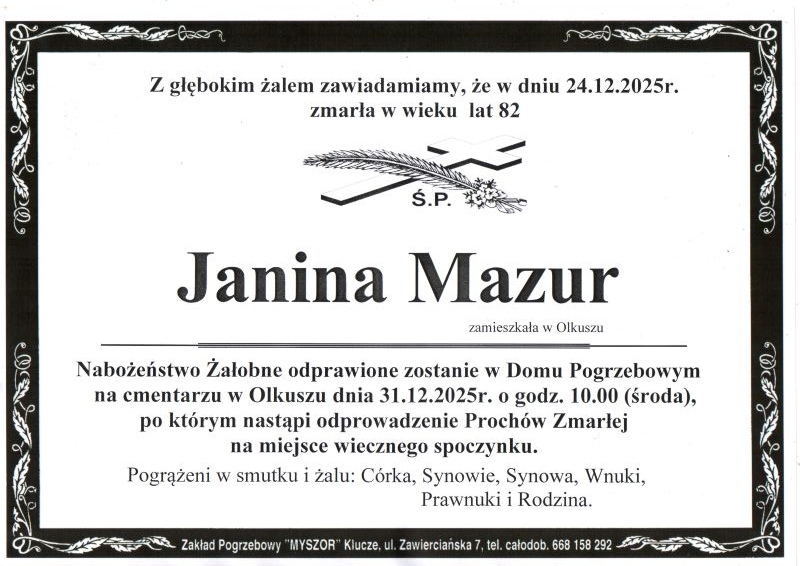 Pogrzeb śp. Janiny Mazur odbędzie się w dniu 31 grudnia 2025 r. Nabożeństwo żałobne o godz. 10.00 w Domu Pogrzebowym na cmentarzu w Olkuszu. Sprawdź szczegóły uroczystości pogrzebowych klikając w klepsydrę… Modlimy się za duszę śp. Janiny, a rodzinie zmarłej składamy kondolencje.
