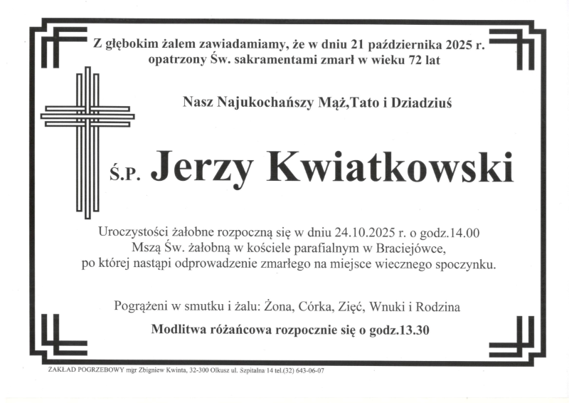 Pogrzeb śp. Jerzego Kwiatkowskiego odbędzie się w dniu 24 października 2025 r. Nabożeństwo żałobne o godz. 14.00 w Kościele Parafialnym w Braciejówce. Sprawdź szczegóły uroczystości pogrzebowych klikając w klepsydrę… Modlimy się za duszę śp. Jerzego, a rodzinie zmarłego składamy kondolencje.