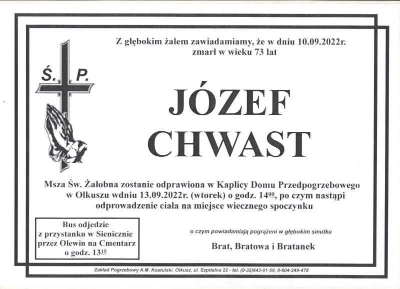 Pogrzeb śp. Józefa Chwasta odbędzie się w dniu 13 września 2022 r. Nabożeństwo żałobne o godz. 14.00 w Domu Przedpogrzebowym na cmentarzu w Olkuszu. Sprawdź szczegóły uroczystości pogrzebowych klikając w klepsydrę… Modlimy się za duszę śp. Józefa, a rodzinie zmarłego składamy kondolencje.