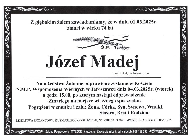 Zmarł śp. Józef MADEJ (lat 74) – (Jaroszowiec).
