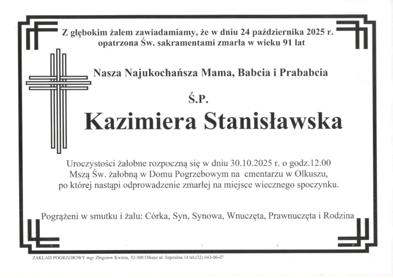 Zmarła śp. Kazimiera STANISŁAWSKA (lat 91) – (Olkusz).